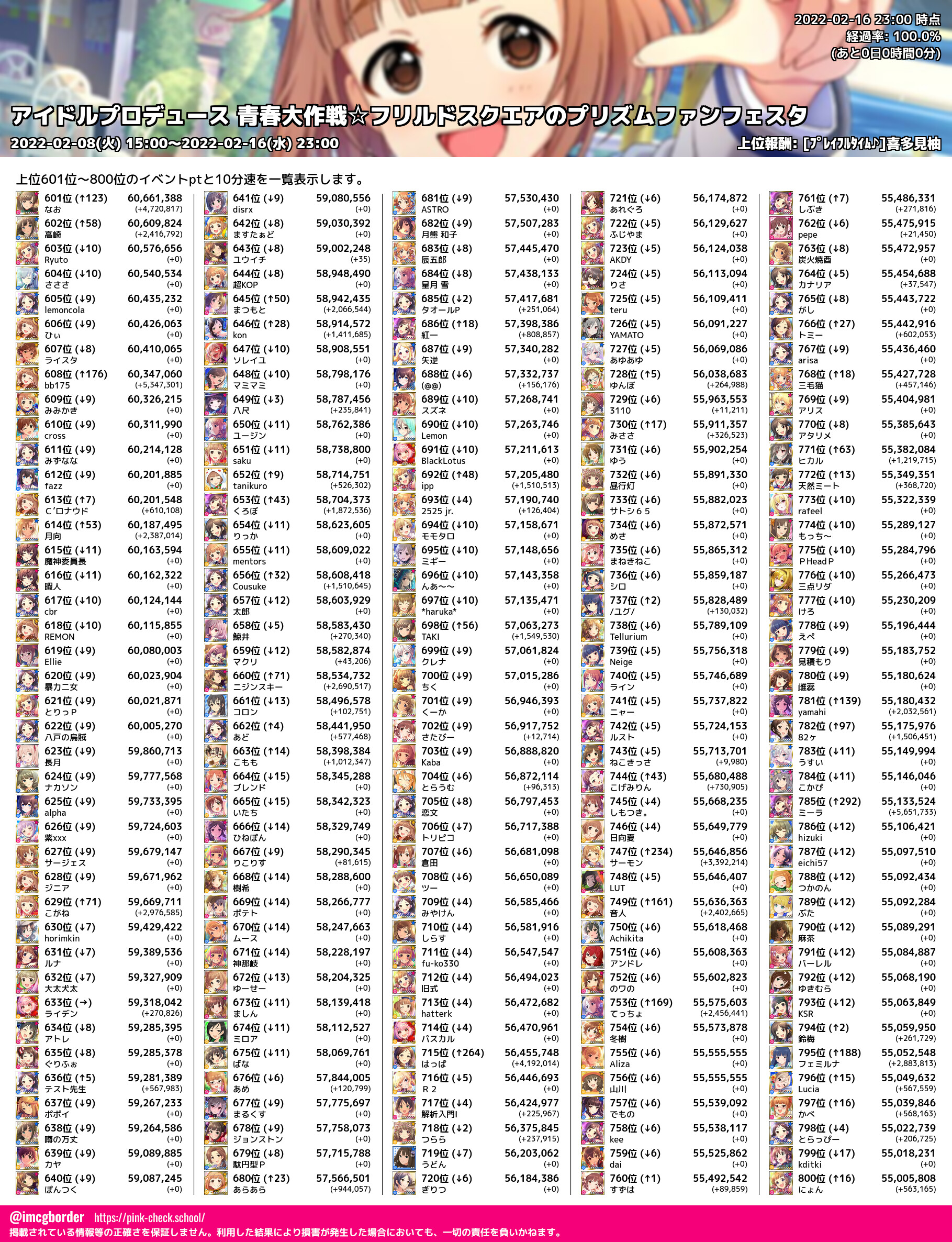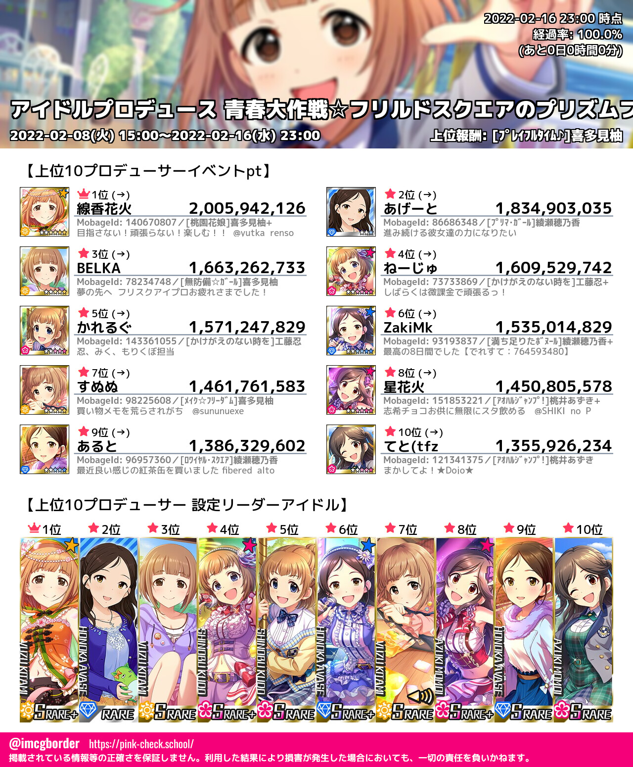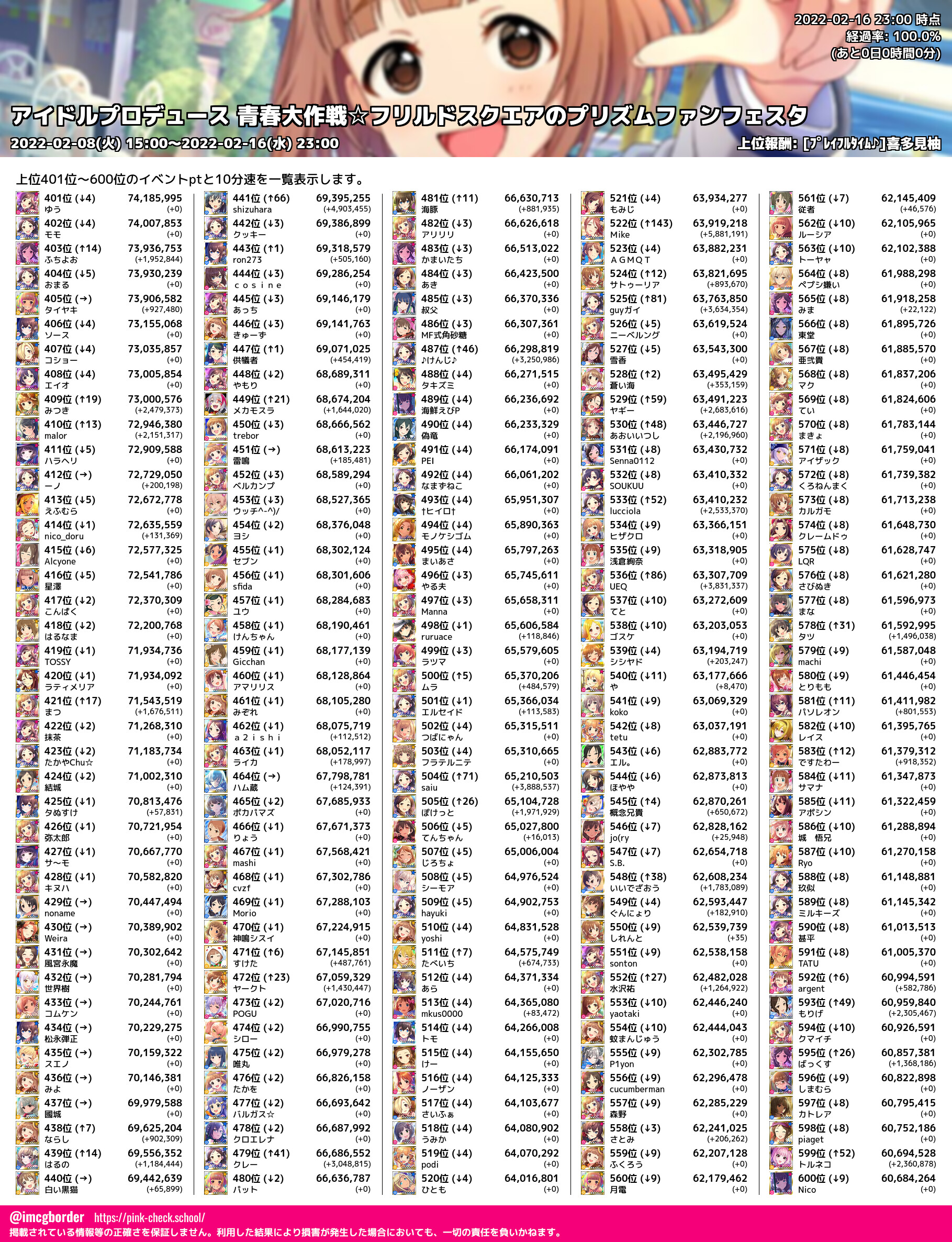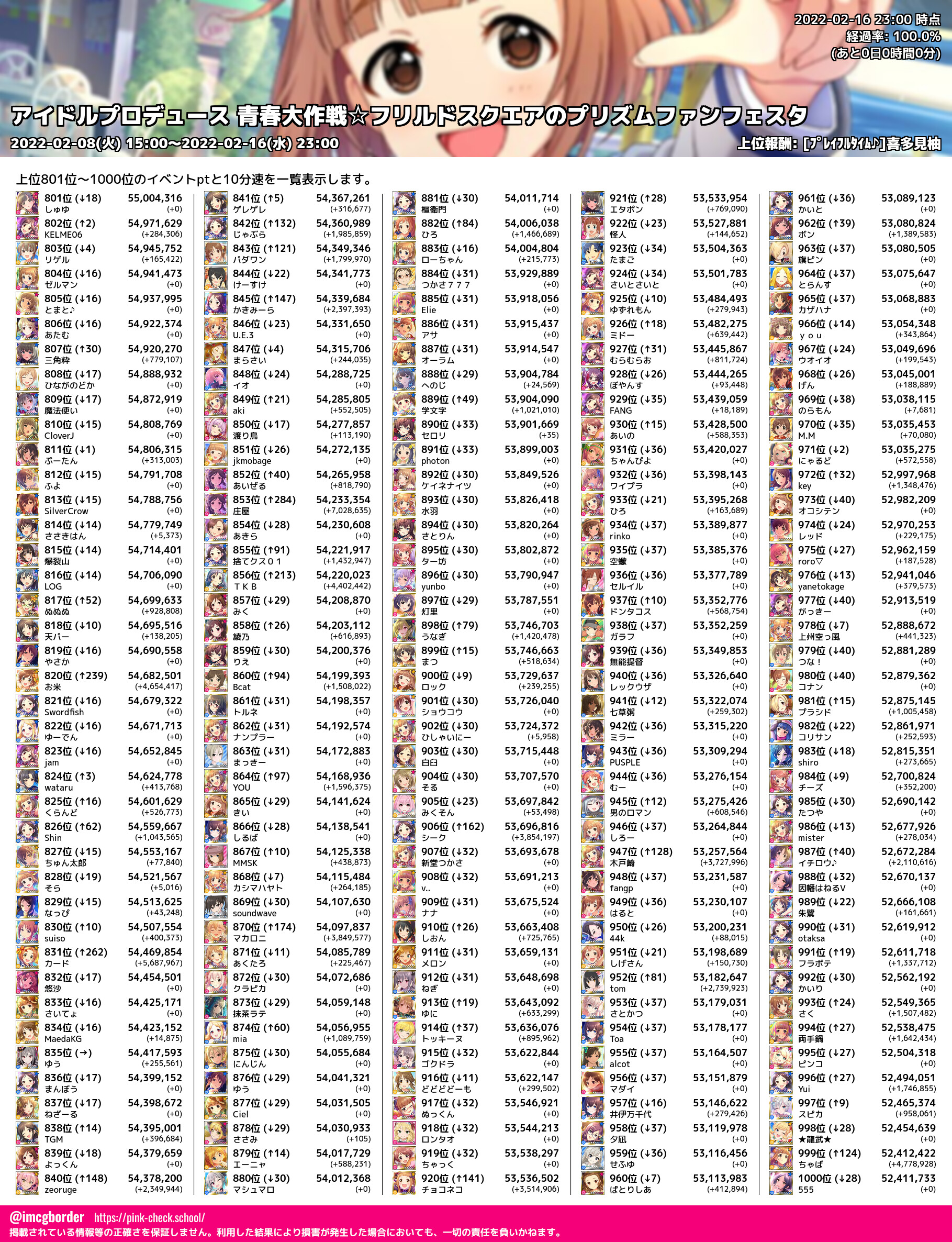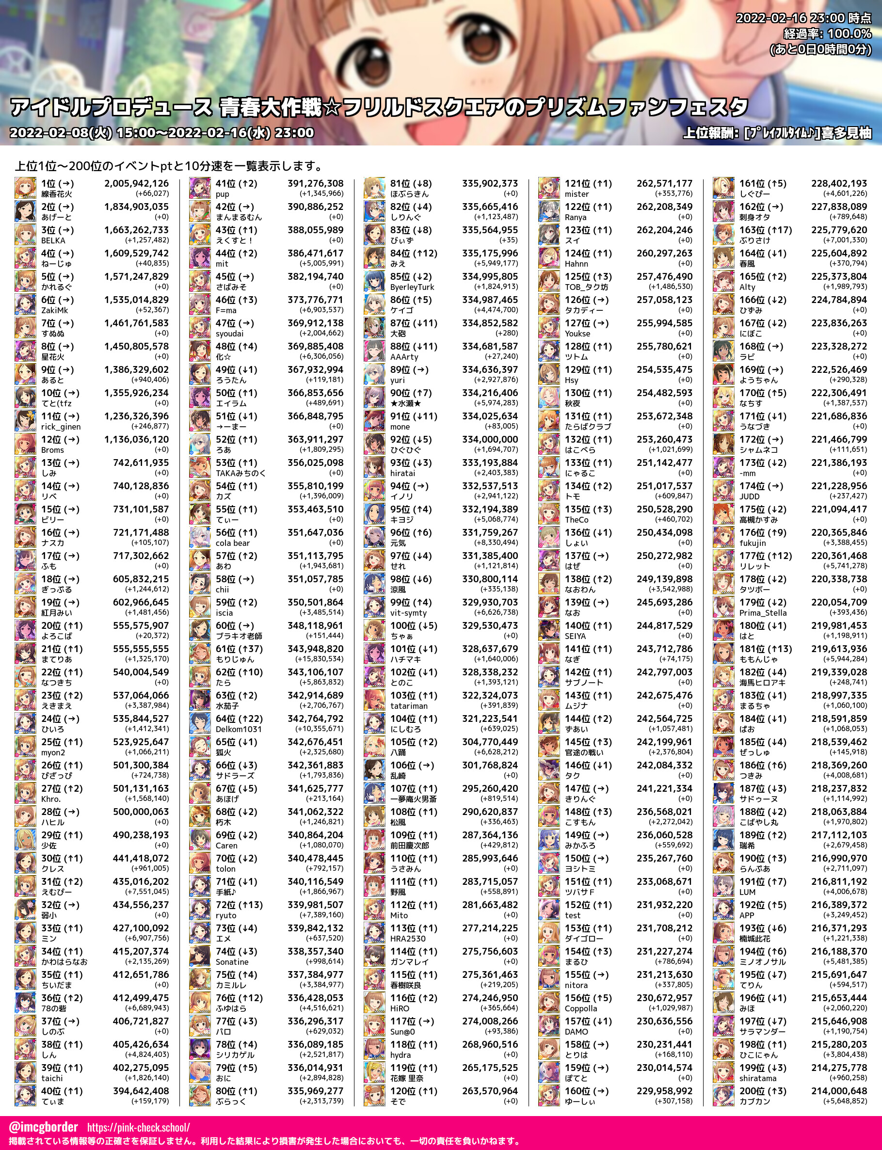 上位プロデューサースコア (2022-02-16 23:00 時点)