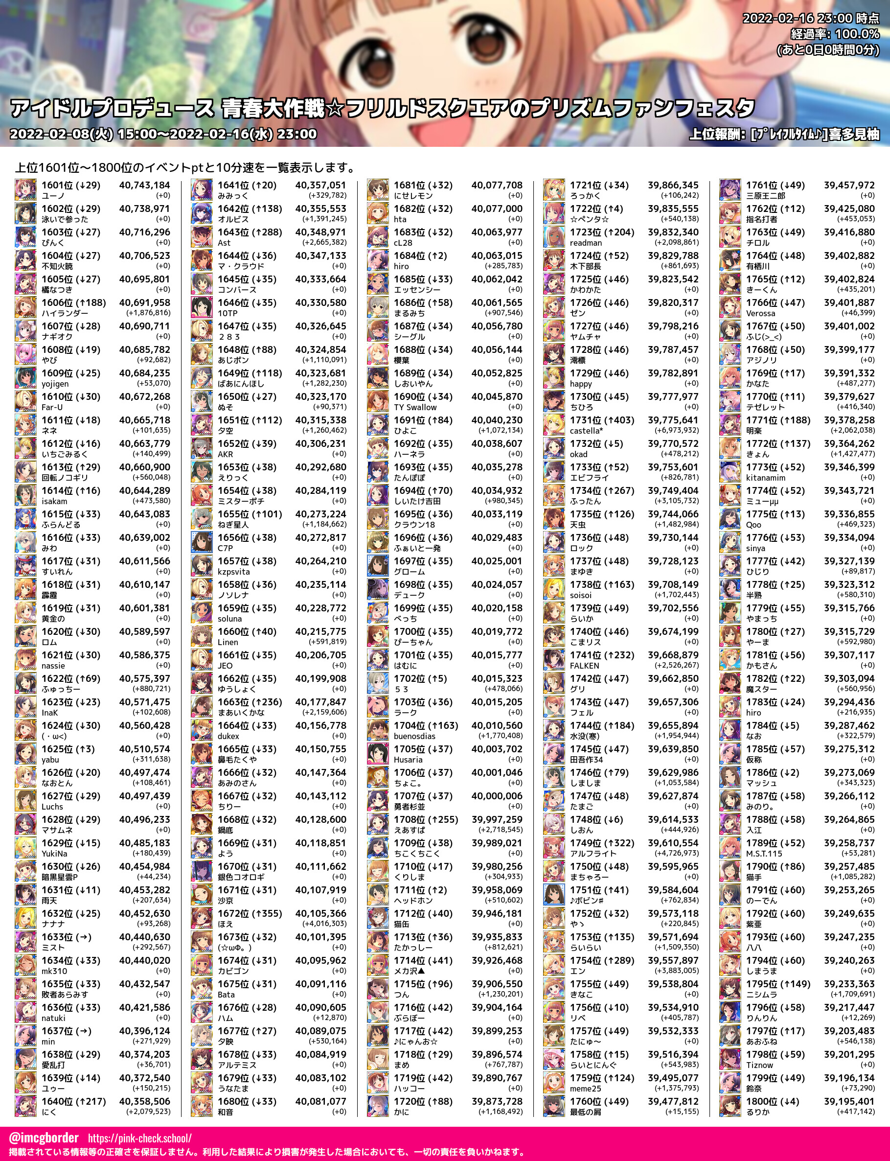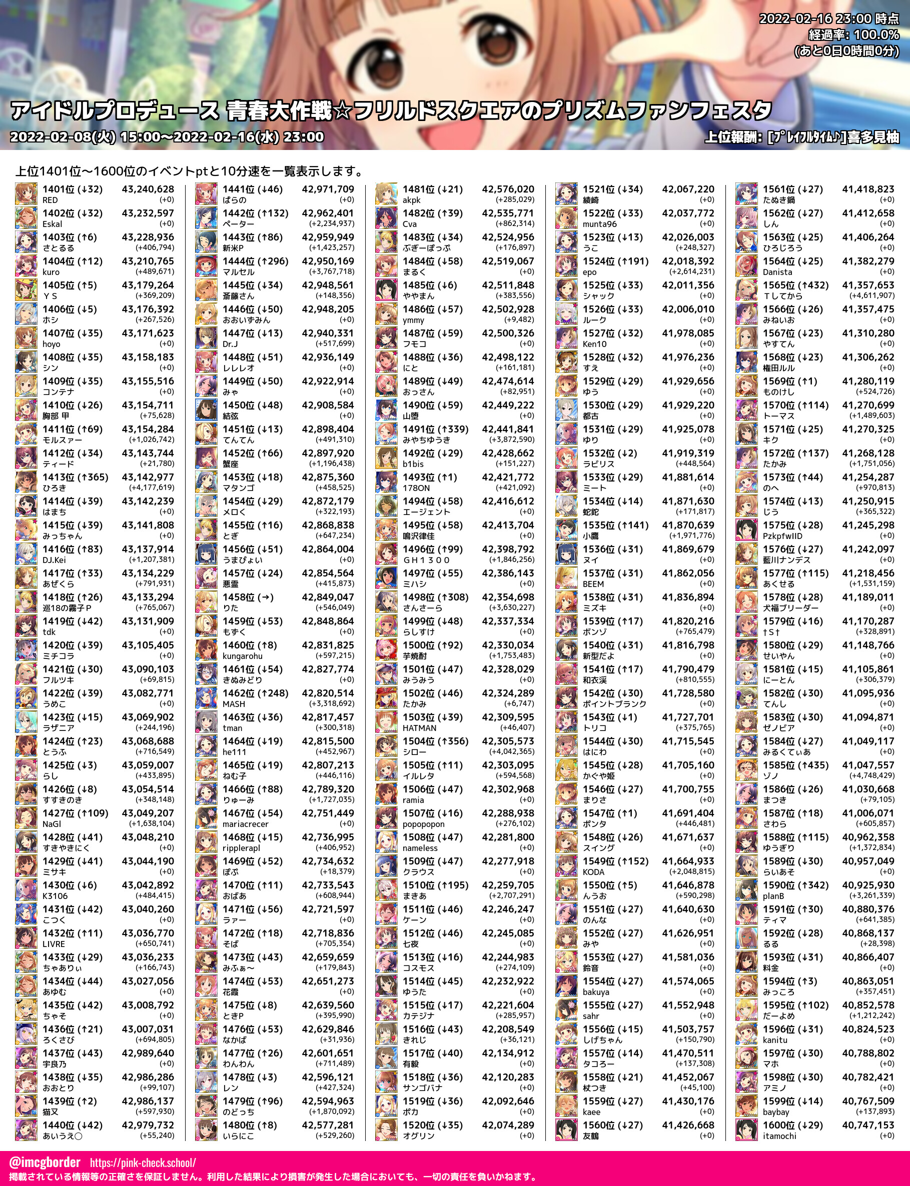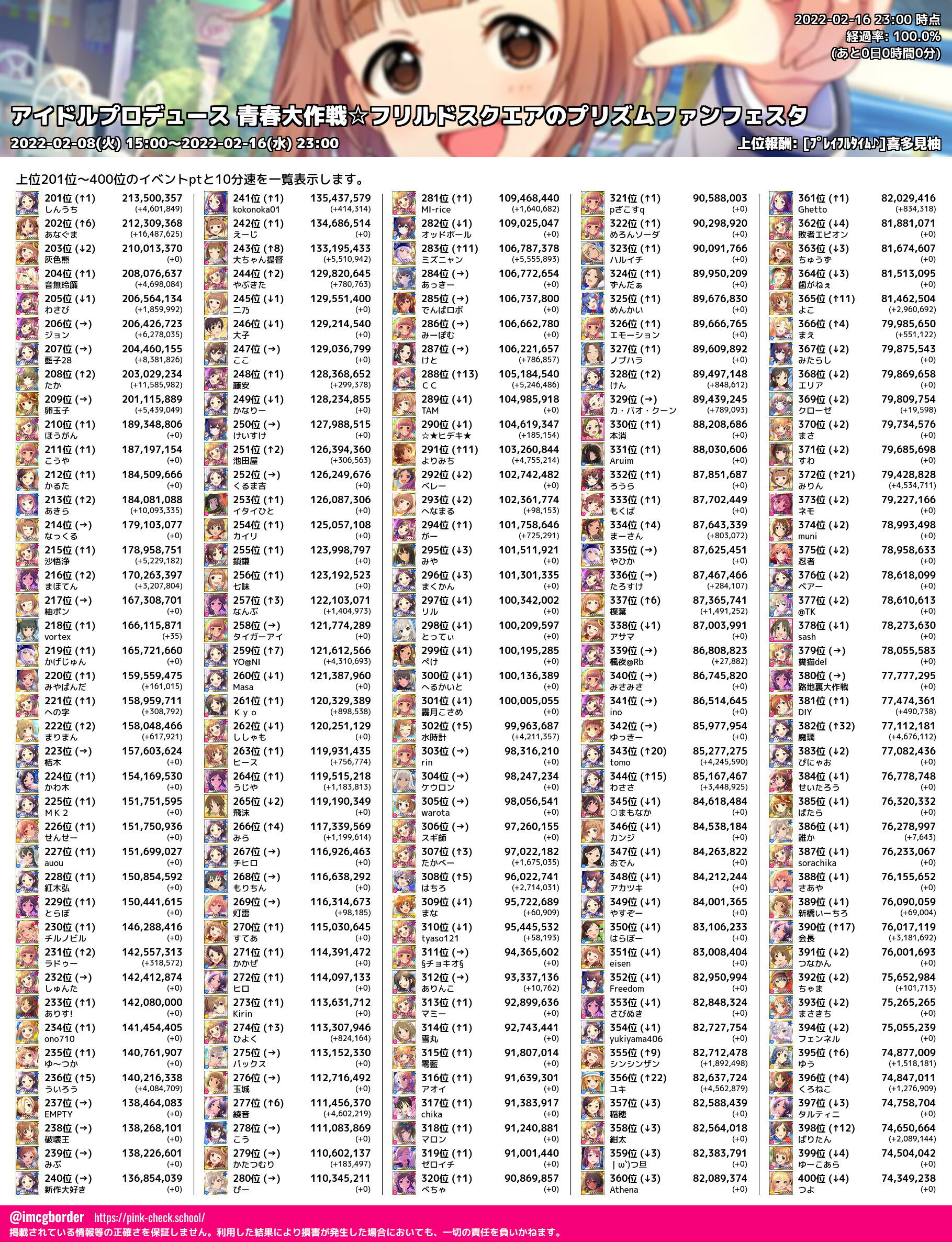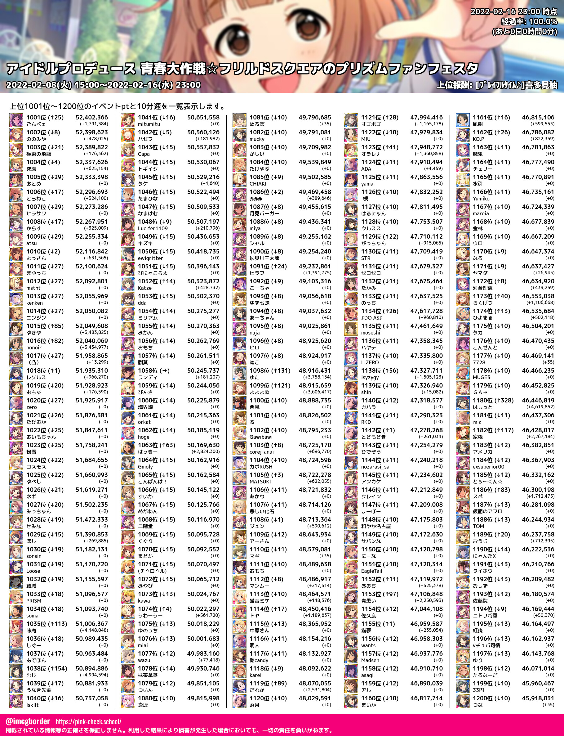 上位プロデューサースコア (2022-02-16 23:00 時点)
