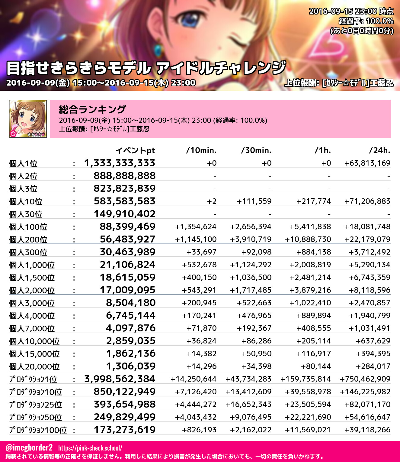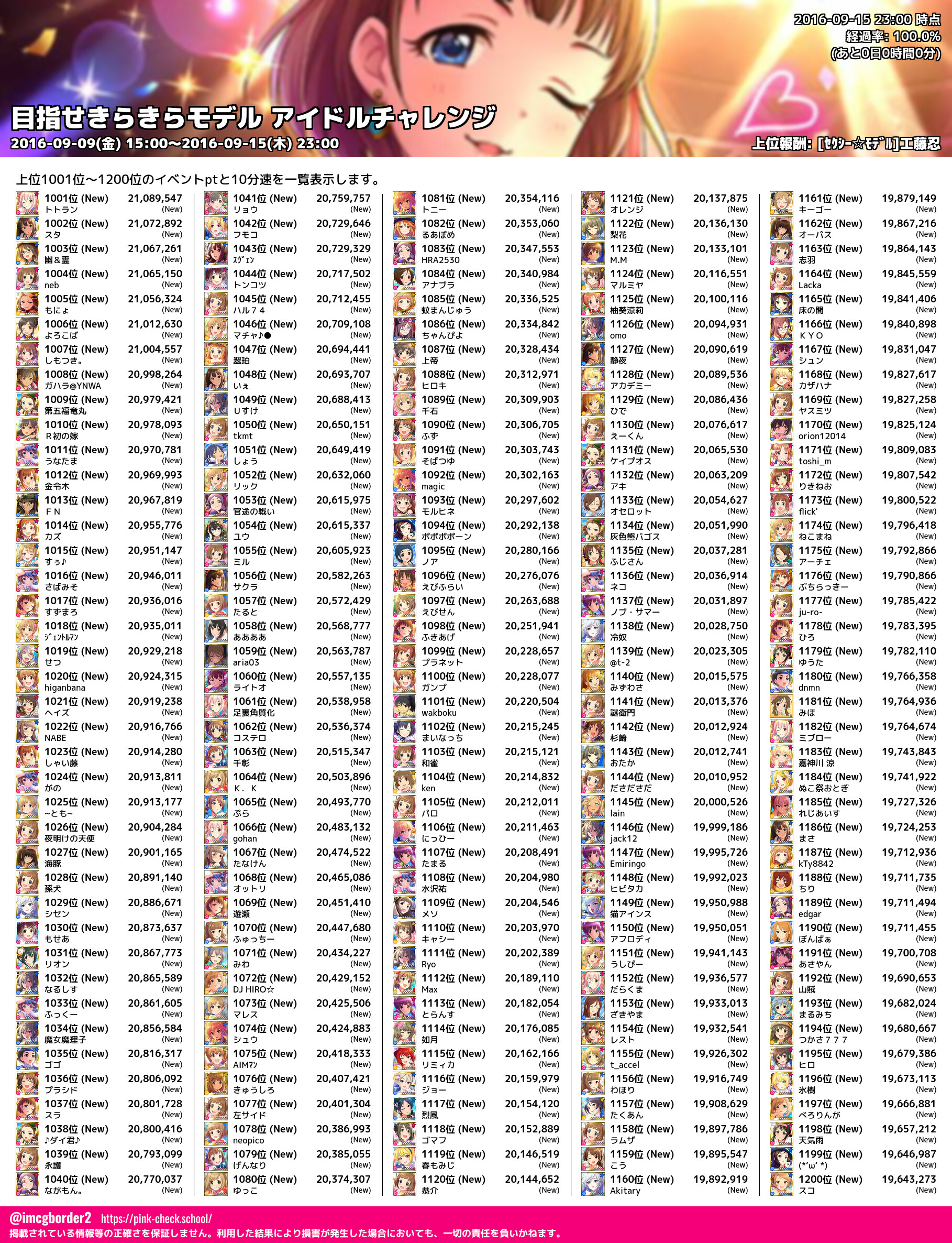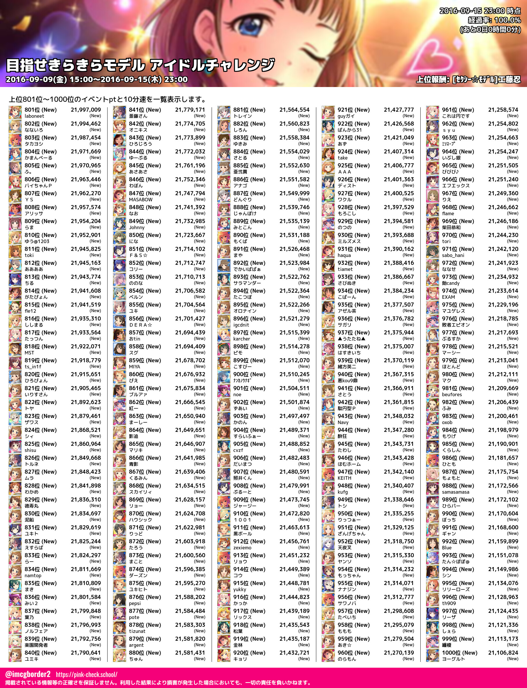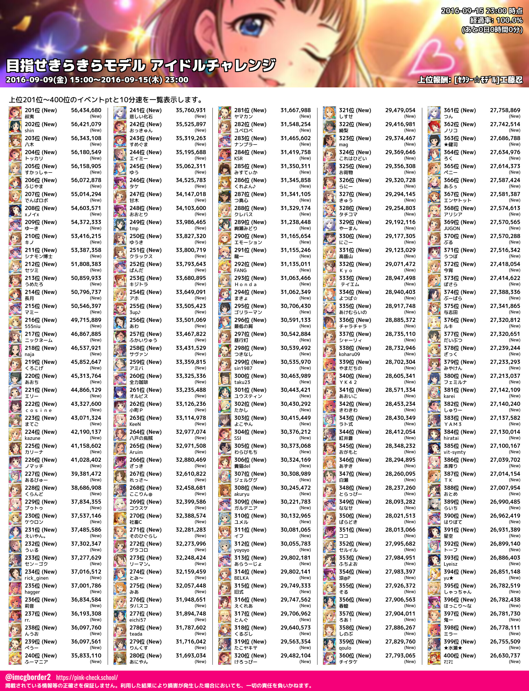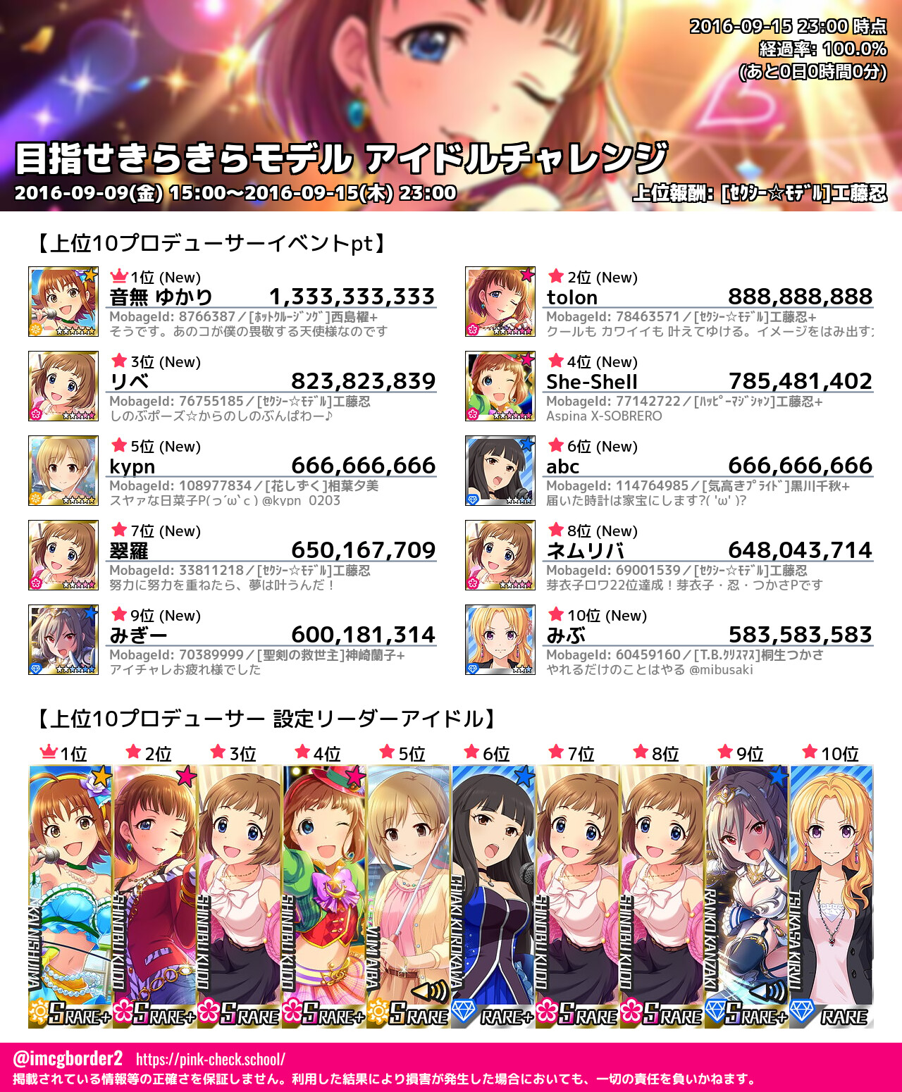 上位プロデューサースコア (2016-09-15 23:00 時点)